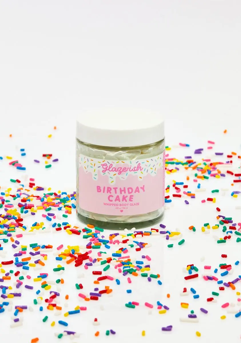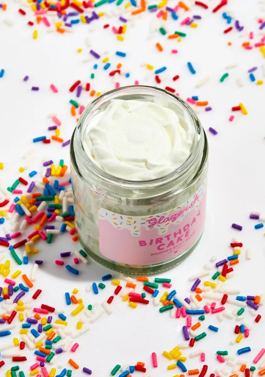 and don’t forget the sprinkles on top! This creamy body glaze has a sweet birthday cake scent, enriching shea butter and oils for protective moisture, and comes in a reusable glass jar.