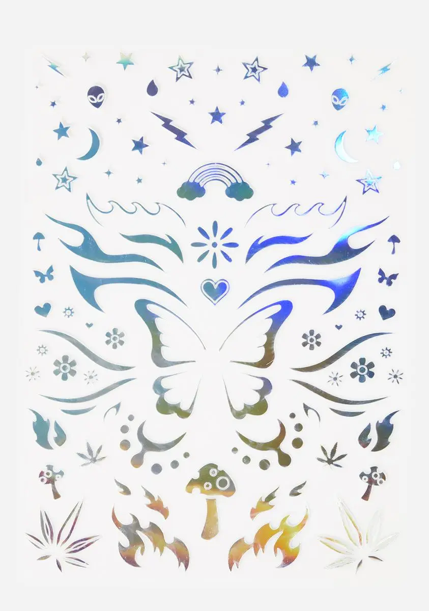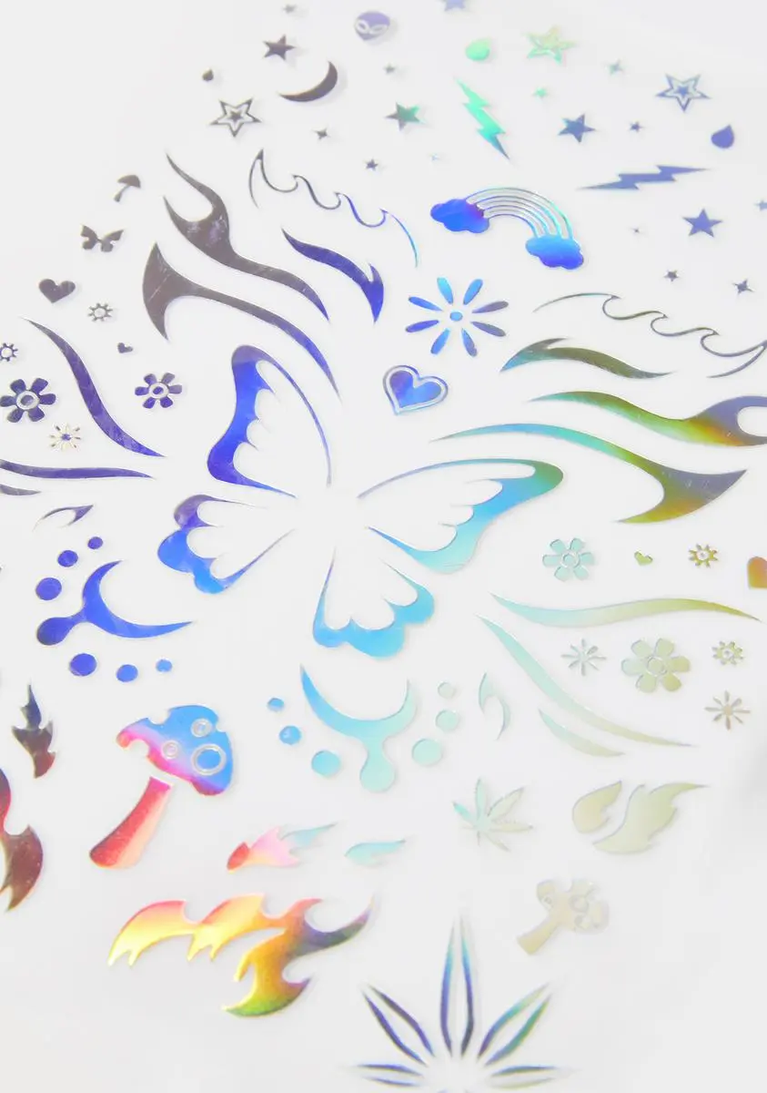 has self-adhesive backings, a holographic shine, and multiple shapes that consist of stars, aliens, lightning bolts, butterflies, shrooms, flames, hearts, and more.